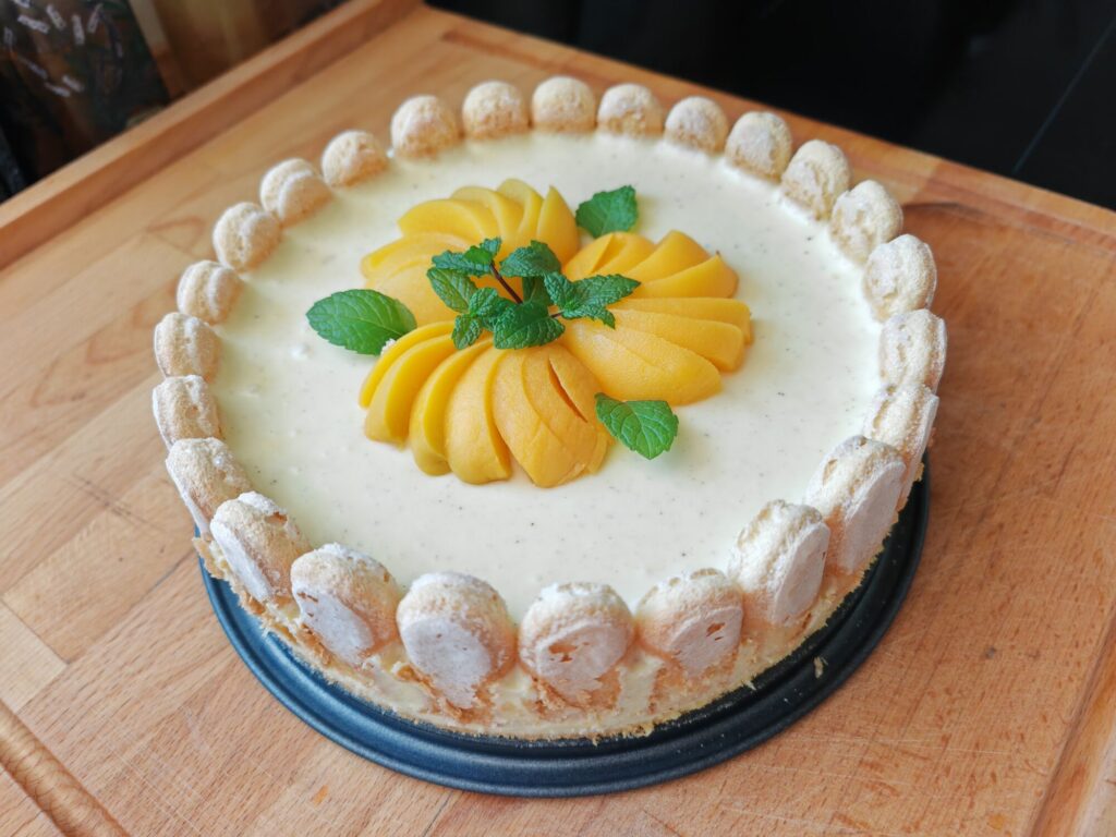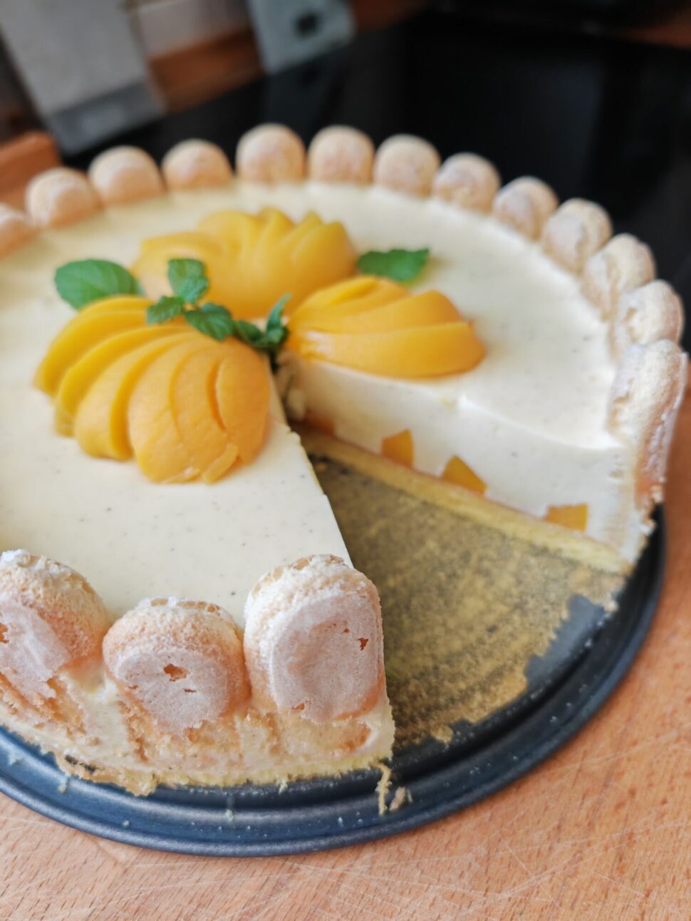 Ušleháme vejce s cukrem a opatrně přimícháme mouku. Nalijeme do dortové formy 25 cm a upečeme do růžova (cca 8 minut na 180°). Necháme vychladnout a formu po obvodu vyskládáme cukrářskými piškoty a na spod naskládáme ovoce,